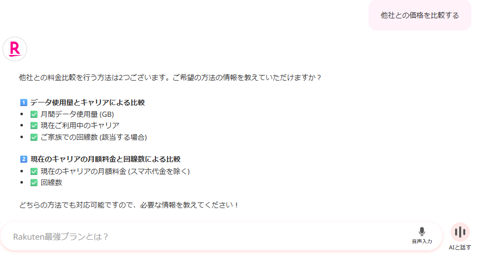 他社との比較や、料金プランを相談できるチャット機能もあります。
